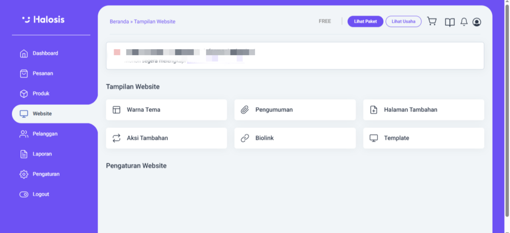 Setelah berhasil login, klik menu Website di dashboard untuk membuka pengaturan tampilan dan konten websitemu.