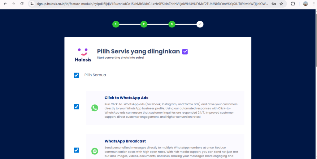 • Daftar akun di Halosis → buka halaman signup Halosis. Hubungkan nomor WhatsApp Bisnis → sambungkan nomor resmi mu ke dashboard Halosis.
